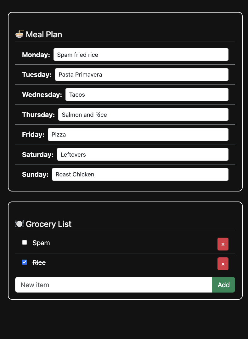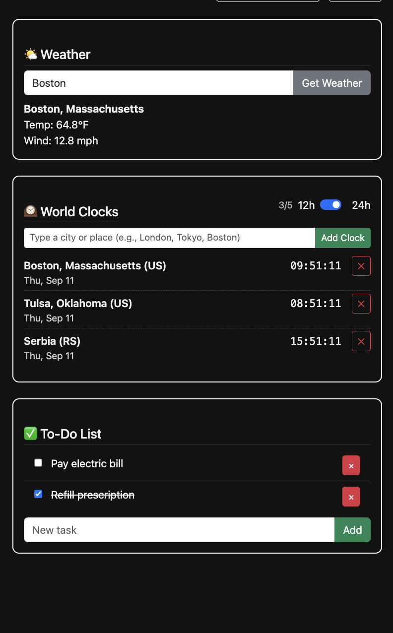 Users can link multiple google calendars (even shared family calendars), with option to color code separate calendars for organization. The meal plan, grocery list, to-do list, and the weather and world clock widgets can be edited right from the UI. Items on the grocery list and to-do list will appear crossed out when checked off, but still visible. You can click on the ‘X’ next to a grocery or to-do item to remove it entirely from view. There is a button at the top of the UI for users to switch between light/dark mode, as well as a ‘refresh’ button if you need to refresh the view.